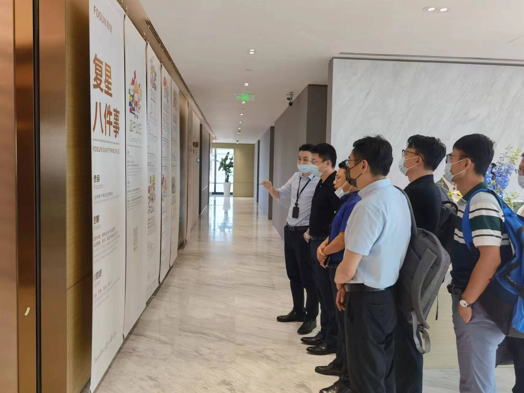 在復(fù)星全球合伙人、復(fù)星創(chuàng)富執(zhí)行總裁、聯(lián)席COO徐廣成的陪同下,余冠敏一行參觀了展廳內(nèi)的復(fù)星集團(tuán)發(fā)展情況、業(yè)務(wù)板塊、企業(yè)文化等宣傳材料。